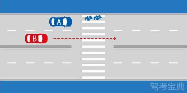 如图所示,当越过停在人行横道前的A车时,B车应当减速,准备停车让行。