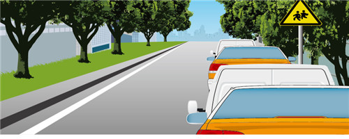 如图所示,驾驶机动车看到路边有这种标志时,表示前方接近学校区域,因此要提前减速注意观察。
