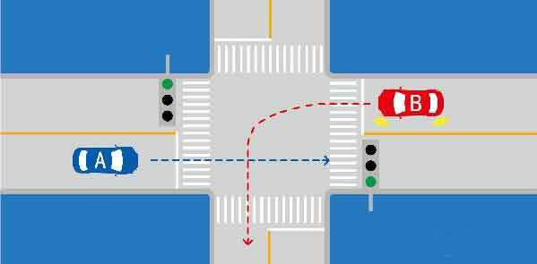 解释:如图所示,A车是直行,B车是左转。转弯让直行,A车享有优先通过权。