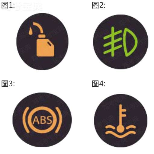 解释:图1表示机油指示灯;图2表示前雾灯显示;图3是ABS指示灯,ABS就是防抱死系统的简称;图4是水温指示灯。